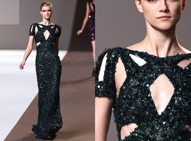 It’s been a while since I religiously kept track of what my favourite couture designer, Elie Saab was up to. I had no idea what his latest collections looked like until the other day when I decided to stalk his Paris Fashion week Fall collection (delayed, I know). While a lot of Saab’s collection plays it safe, teasing hints of lace and geometric cut-outs still provide an edge, the clear process each garment has gone through is what leaves me in awe. The main reason that I will call him my favourite couture designer has been his constant attention to fine detail. There is nothing better than tiny special detail on a garment, no matter what that garment may be. It tells me firstly that the designer loves what he is doing and has played a constant role in overseeing the whole process of his creation, putting lots of thought into his work, thus making me respect him/her even more.