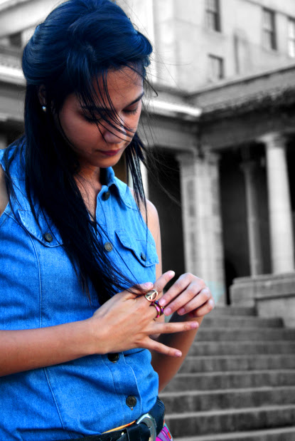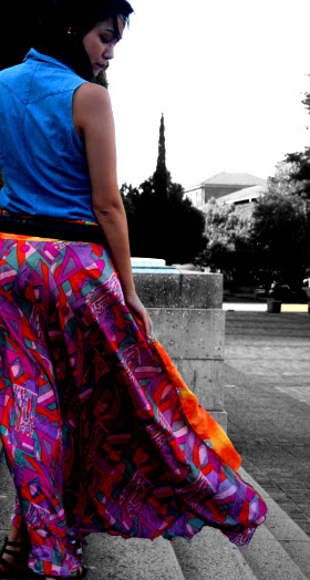 thrifted denim shirt, 100% silk wrap skirt from India, leather gladiators from Mr Price, peace-sign ring from Claire’s, Set of three rings from Accessorize